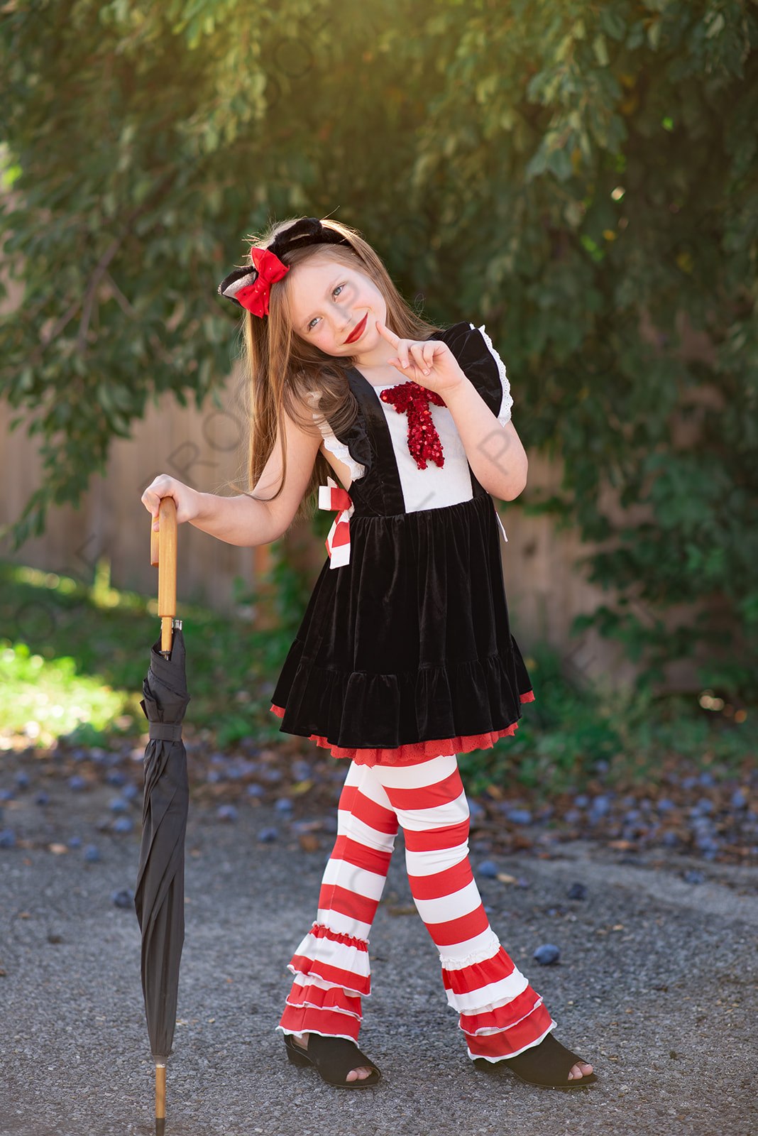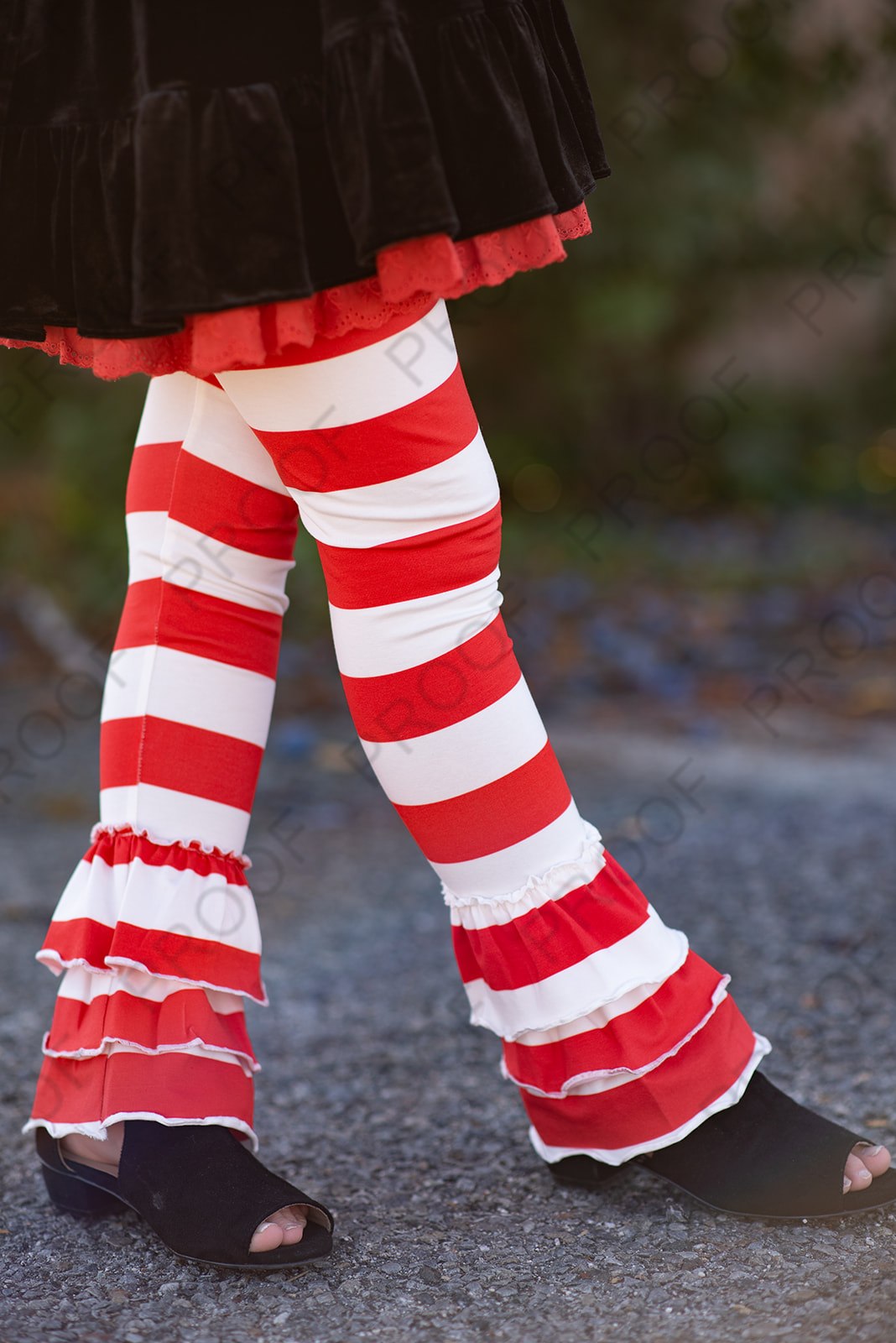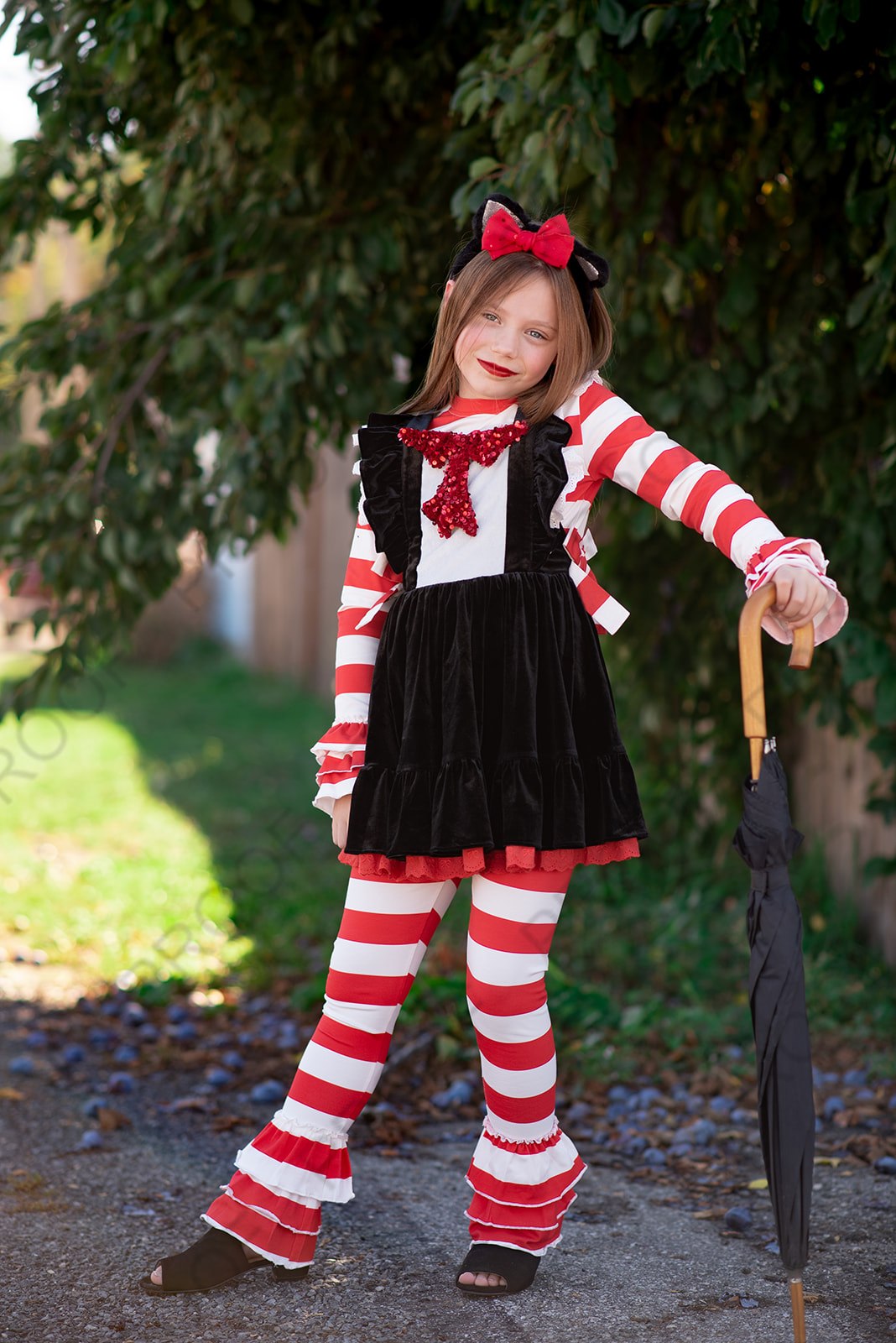 The design echoes the Cat in the Hat’s iconic top hat with a bold striped motif swirling around the legs. At the hem, a cascading **triple “hat‑brim” ruffle** nods to the cat’s tall, ringed crown—adding bounce and flourish with every step.