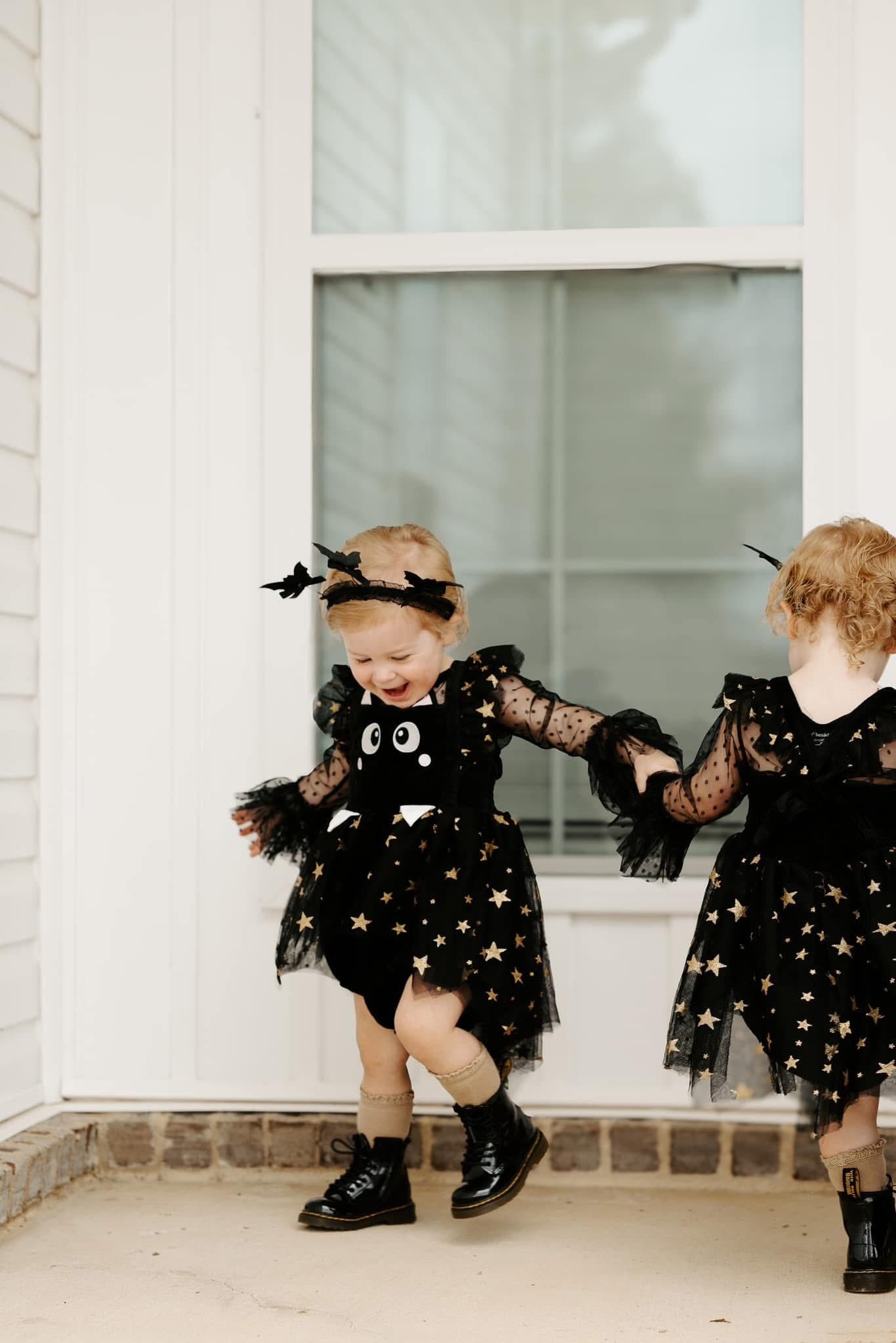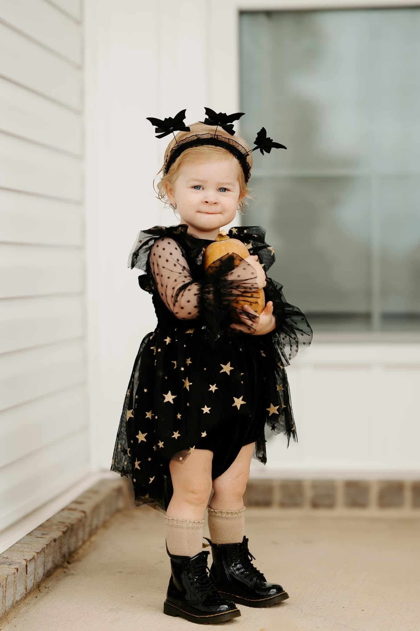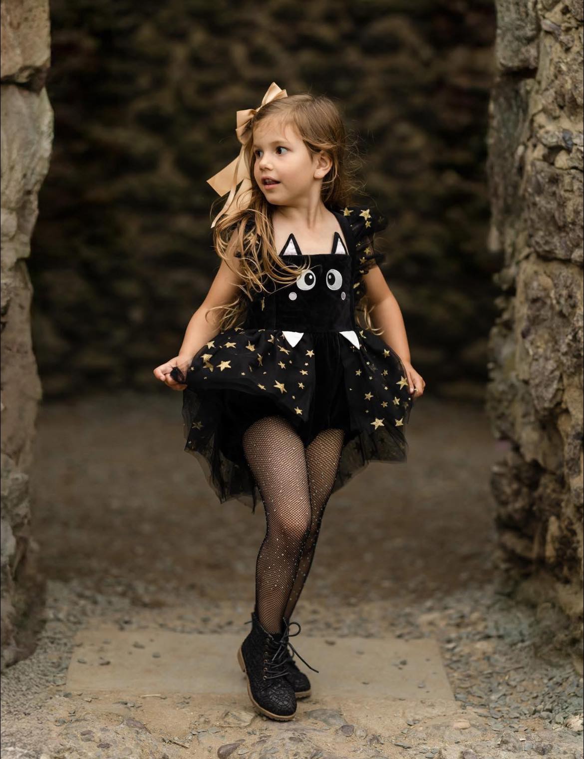 Spooktacular Luna Batty! This Halloween-ready romper brings all the festive fun with a plush velvet bat face bodice—complete with sweet little ears and embroidered eyes that peek out playfully. Twinkling gold stars scatter across the flouncy tulle skirt and flutter sleeves like a night sky in flight. It’s soft, cozy, and totally bat-tastic—perfect for trick-or-treating, pumpkin picking, or fluttering through fall fun! 🦇✨