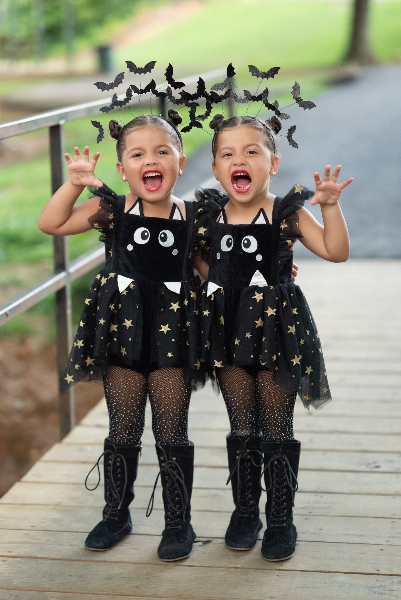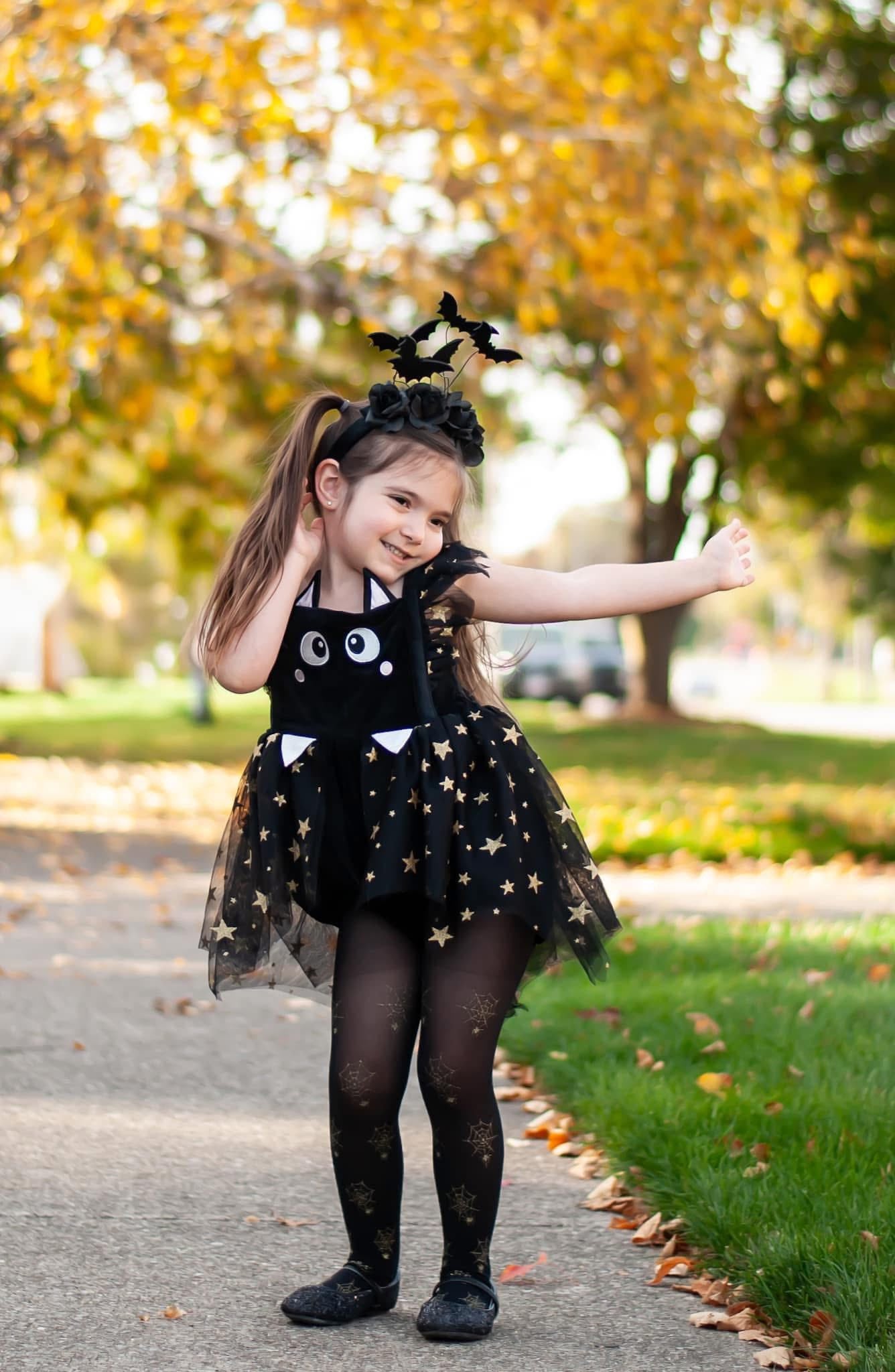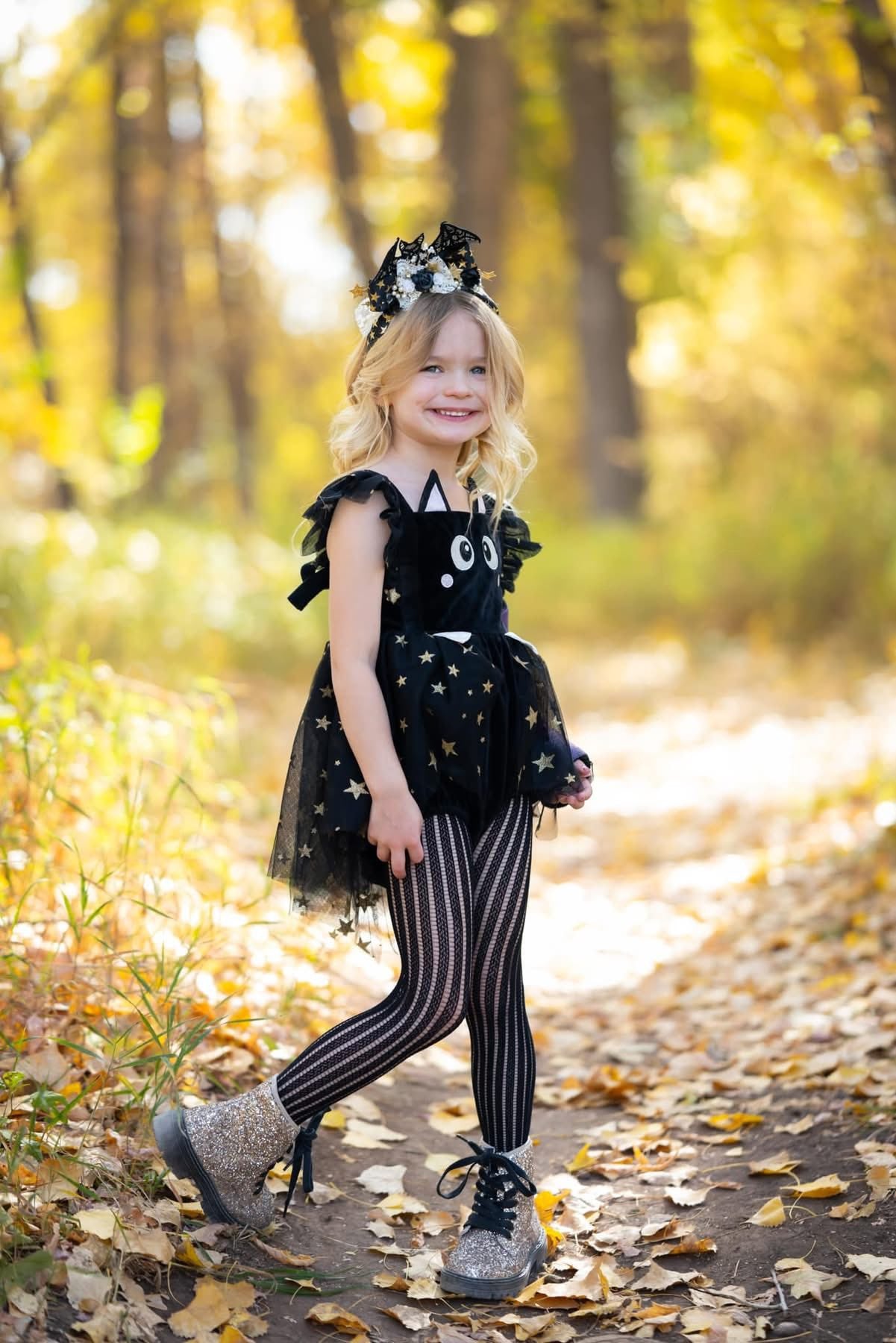 Spooktacular Luna Batty! This Halloween-ready romper brings all the festive fun with a plush velvet bat face bodice—complete with sweet little ears and embroidered eyes that peek out playfully. Twinkling gold stars scatter across the flouncy tulle skirt and flutter sleeves like a night sky in flight. It’s soft, cozy, and totally bat-tastic—perfect for trick-or-treating, pumpkin picking, or fluttering through fall fun! 🦇✨