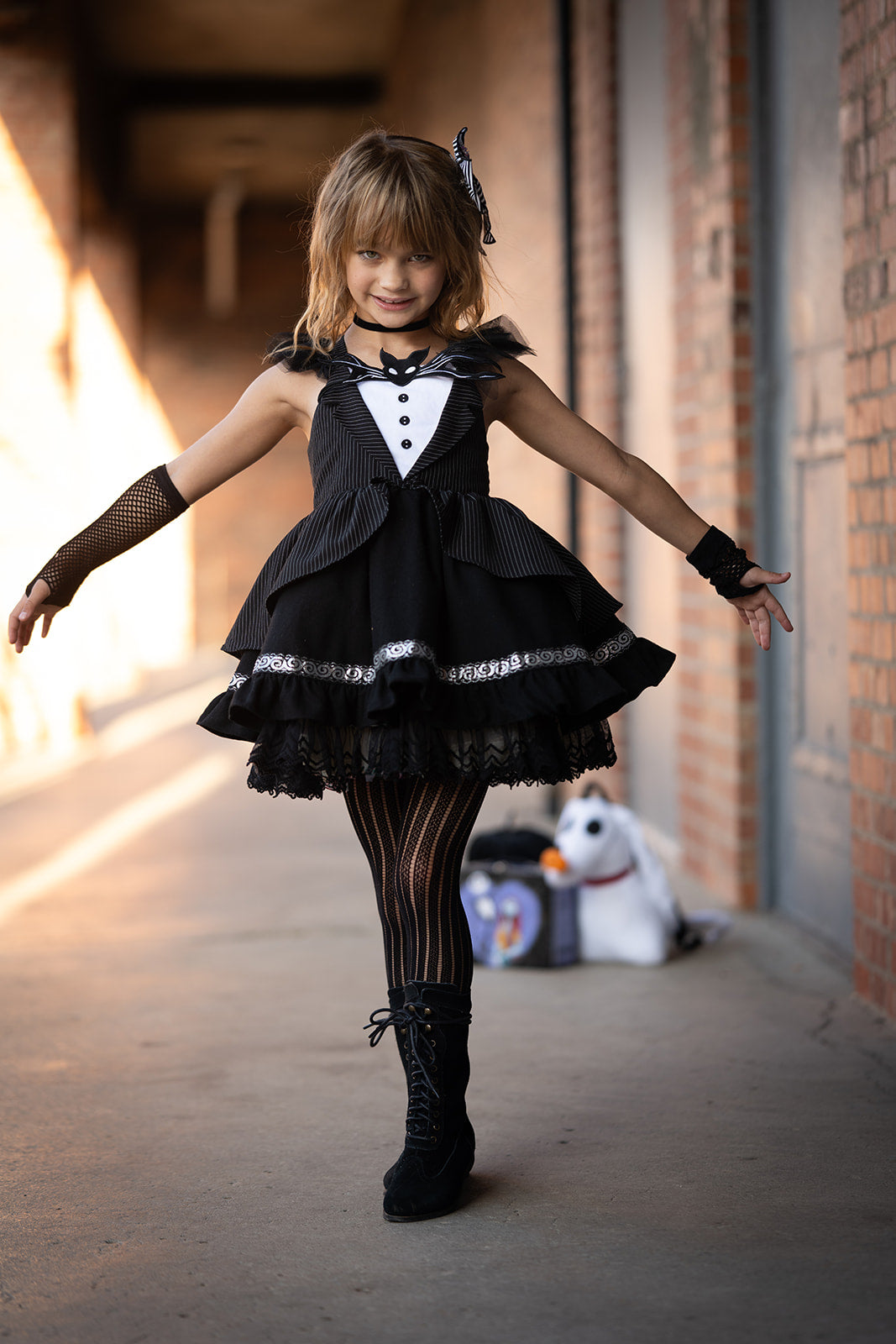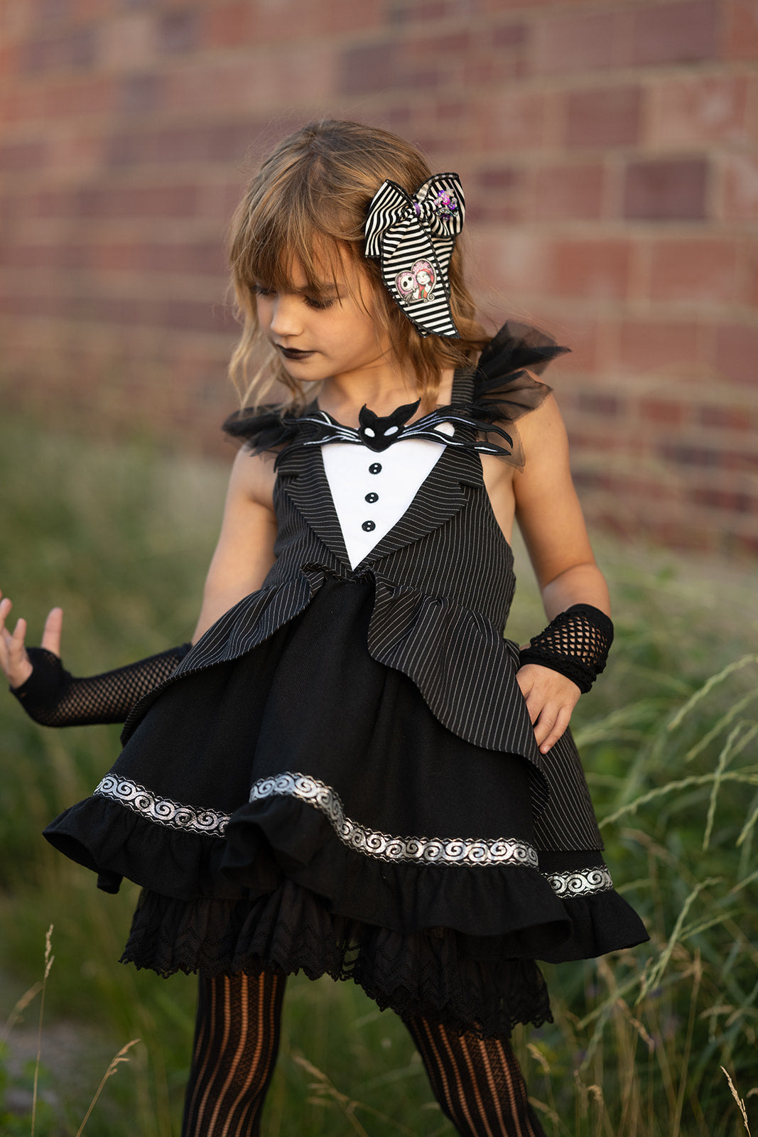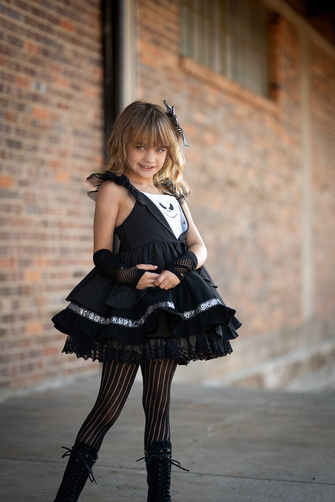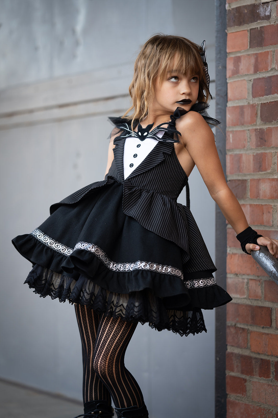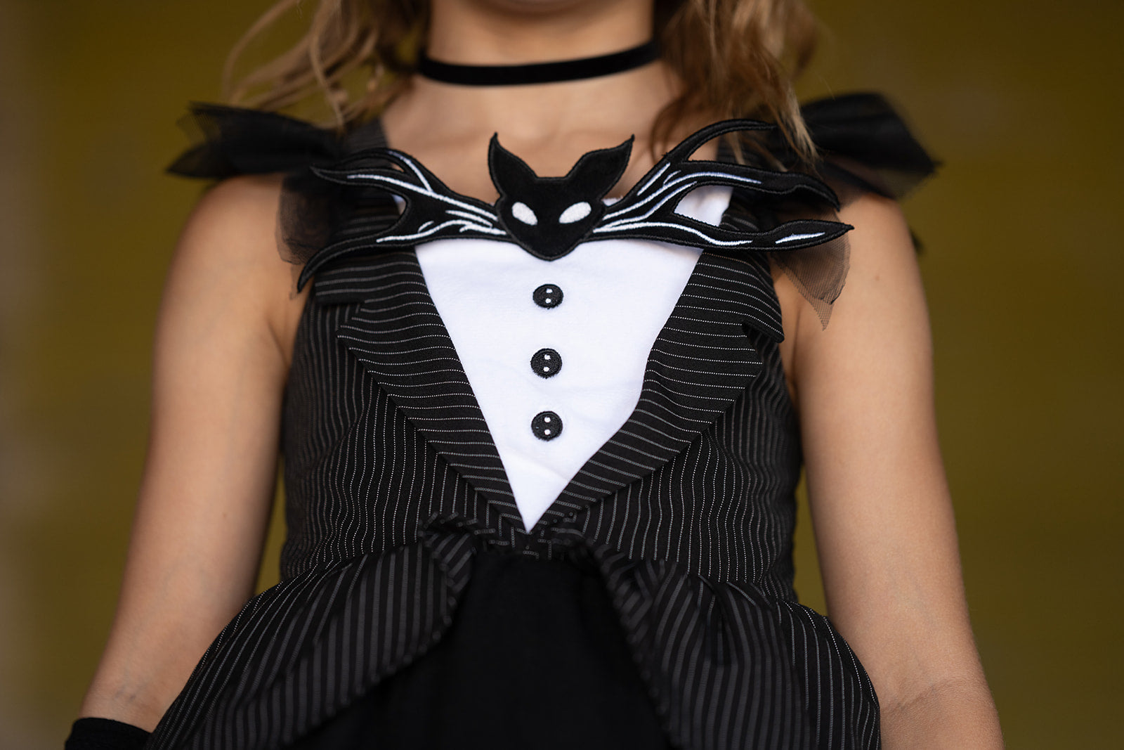 Step aside, Pumpkin King—this 2-in-1 piece reigns supreme! “The King” dress features luxe layers of black velvet, pinstriped jacket, tweed, and linen. With two bodice placards to choose from—Jack himself or a skeletal smile—we went to great lengths to hide every attachment, so each look appears completely seamless. Finished with elegant black lace and embroidered jacquard ribbon on the skirt, this is Halloween royalty at its finest.