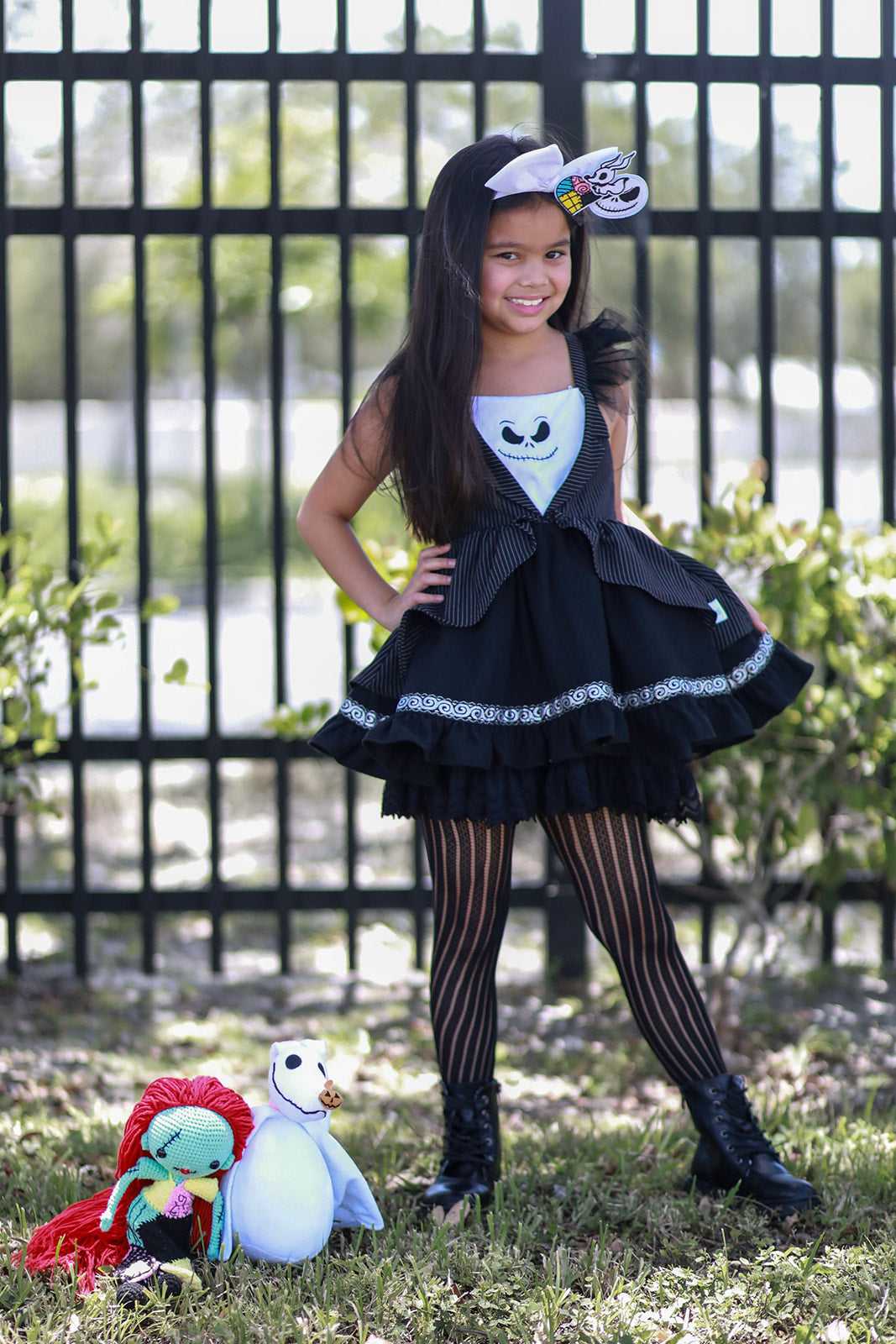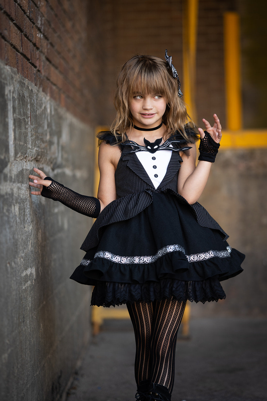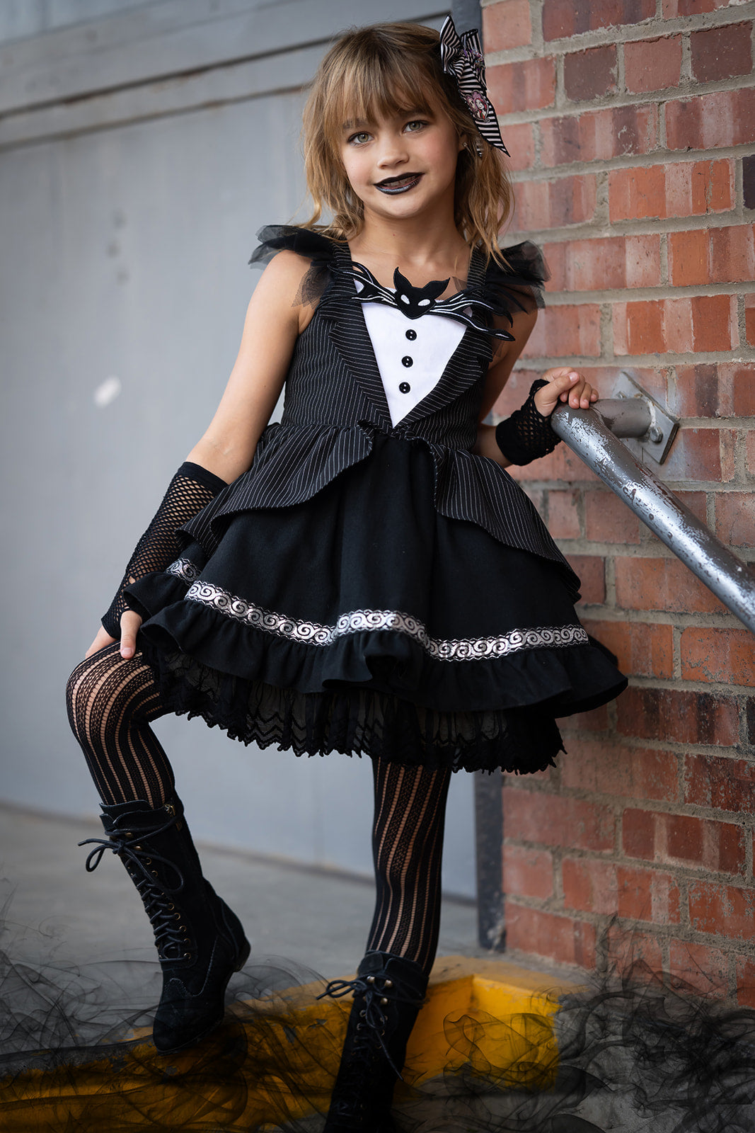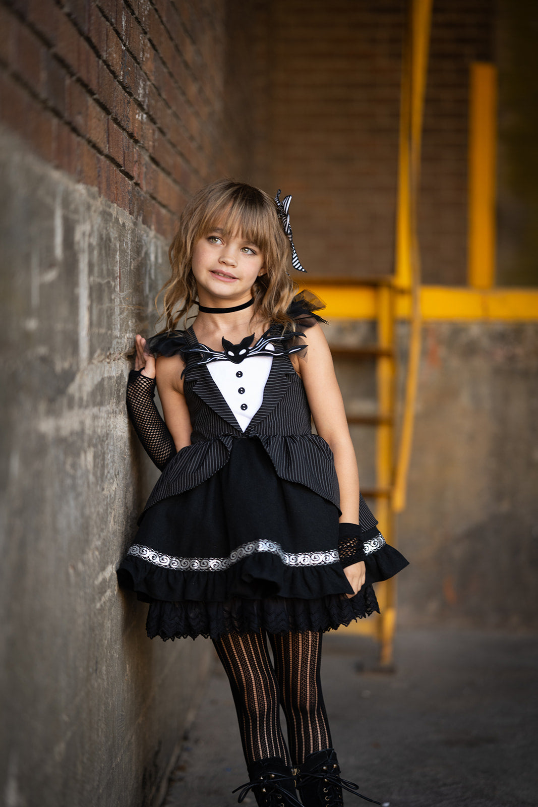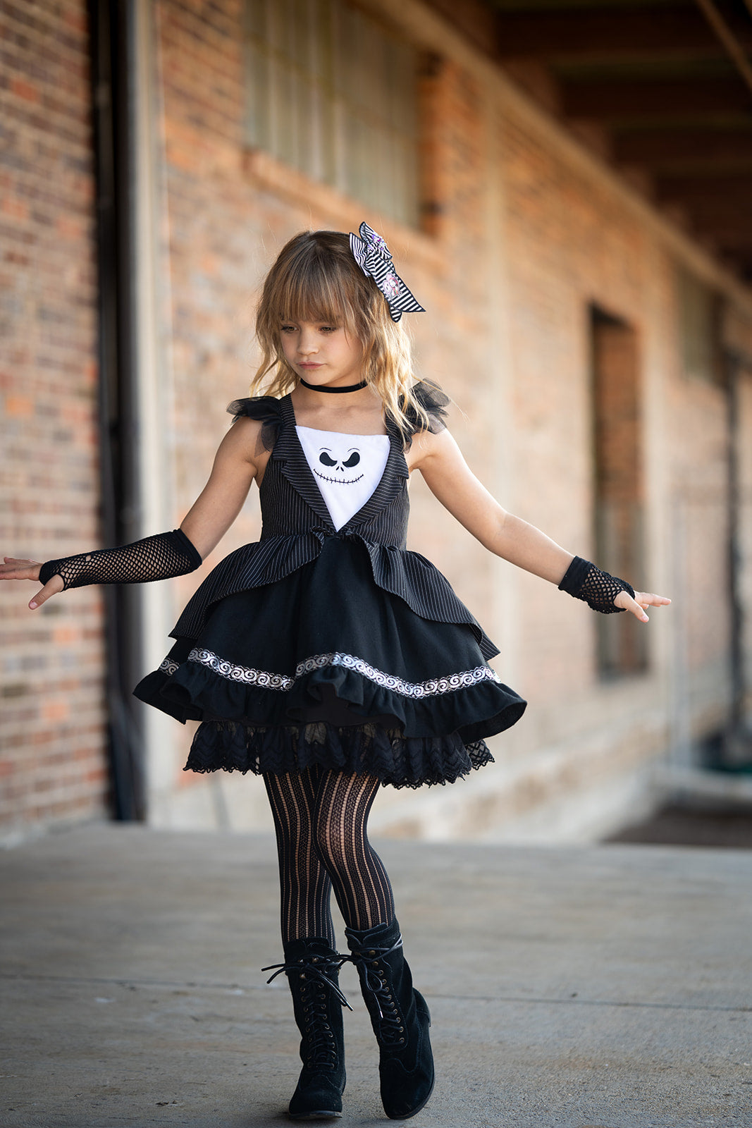 Step aside, Pumpkin King—this 2-in-1 piece reigns supreme! “The King” dress features luxe layers of black velvet, pinstriped jacket, tweed, and linen. With two bodice placards to choose from—Jack himself or a skeletal smile—we went to great lengths to hide every attachment, so each look appears completely seamless. Finished with elegant black lace and embroidered jacquard ribbon on the skirt, this is Halloween royalty at its finest.