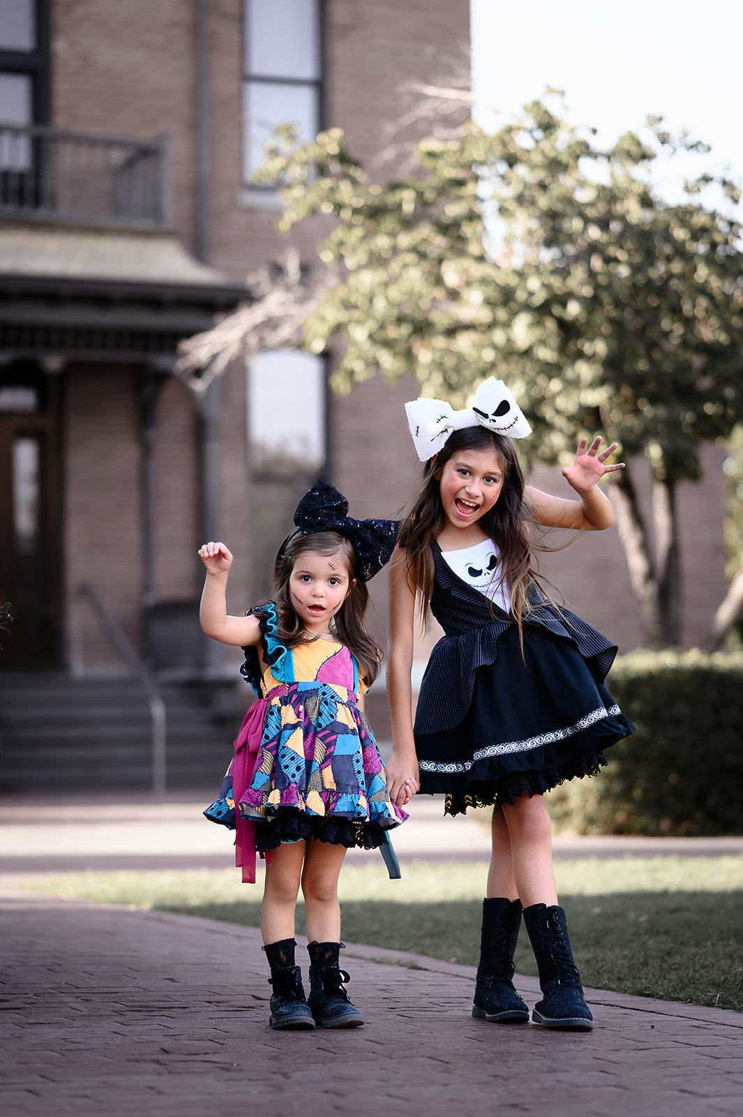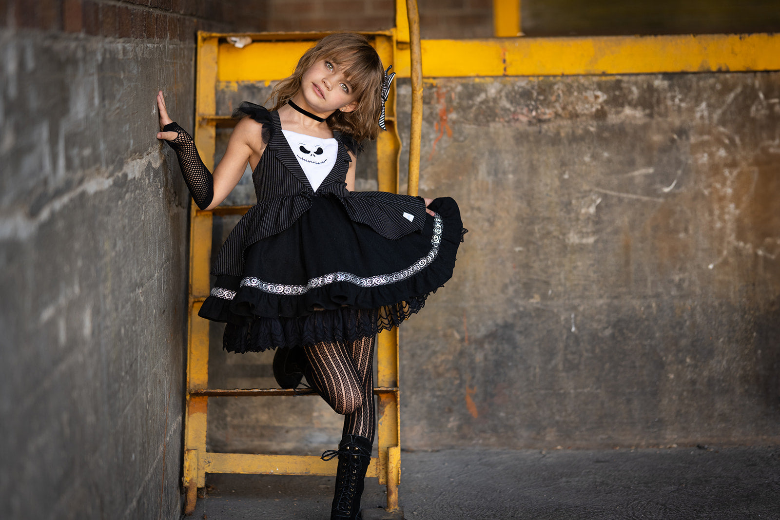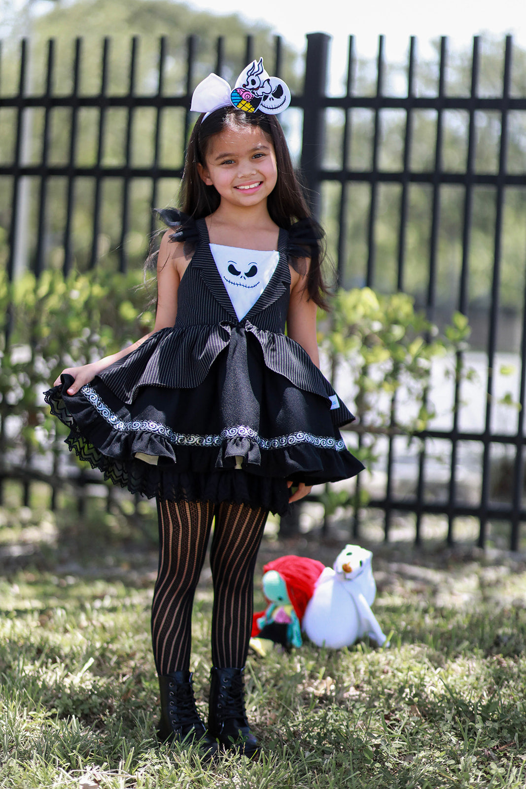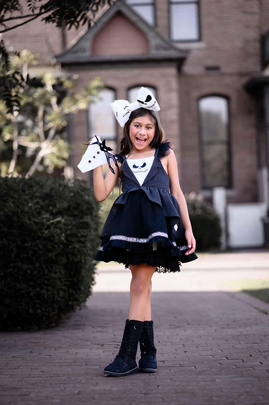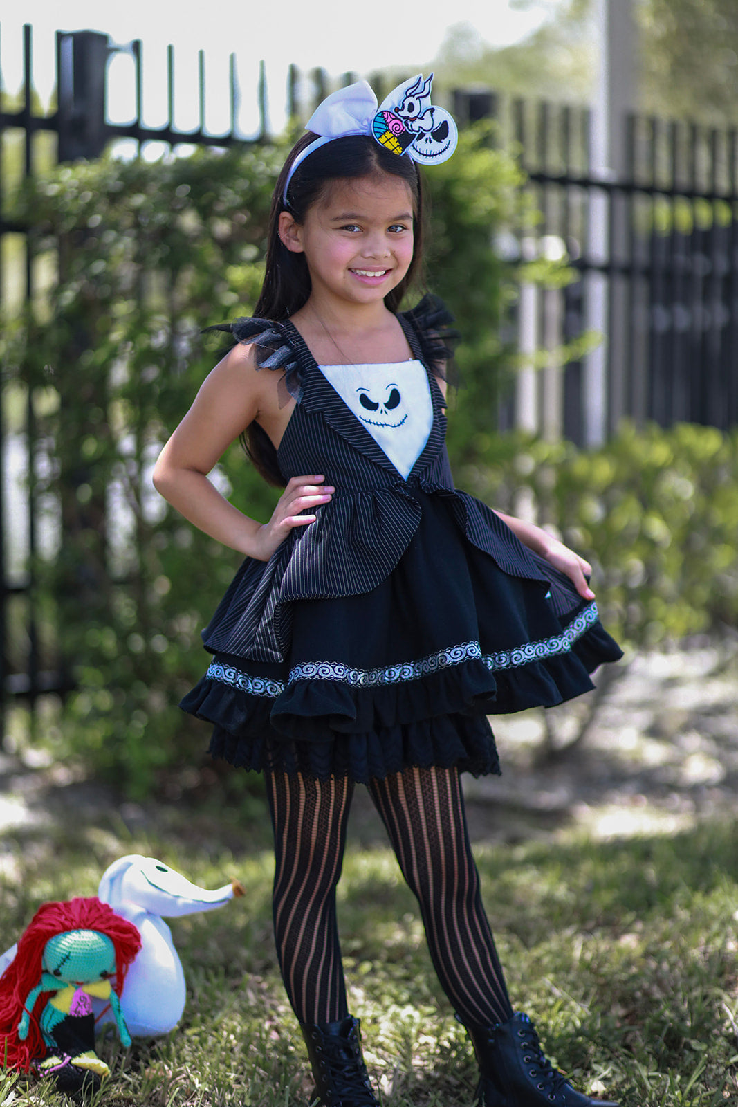 Step aside, Pumpkin King—this 2-in-1 piece reigns supreme! “The King” dress features luxe layers of black velvet, pinstriped jacket, tweed, and linen. With two bodice placards to choose from—Jack himself or a skeletal smile—we went to great lengths to hide every attachment, so each look appears completely seamless. Finished with elegant black lace and embroidered jacquard ribbon on the skirt, this is Halloween royalty at its finest.