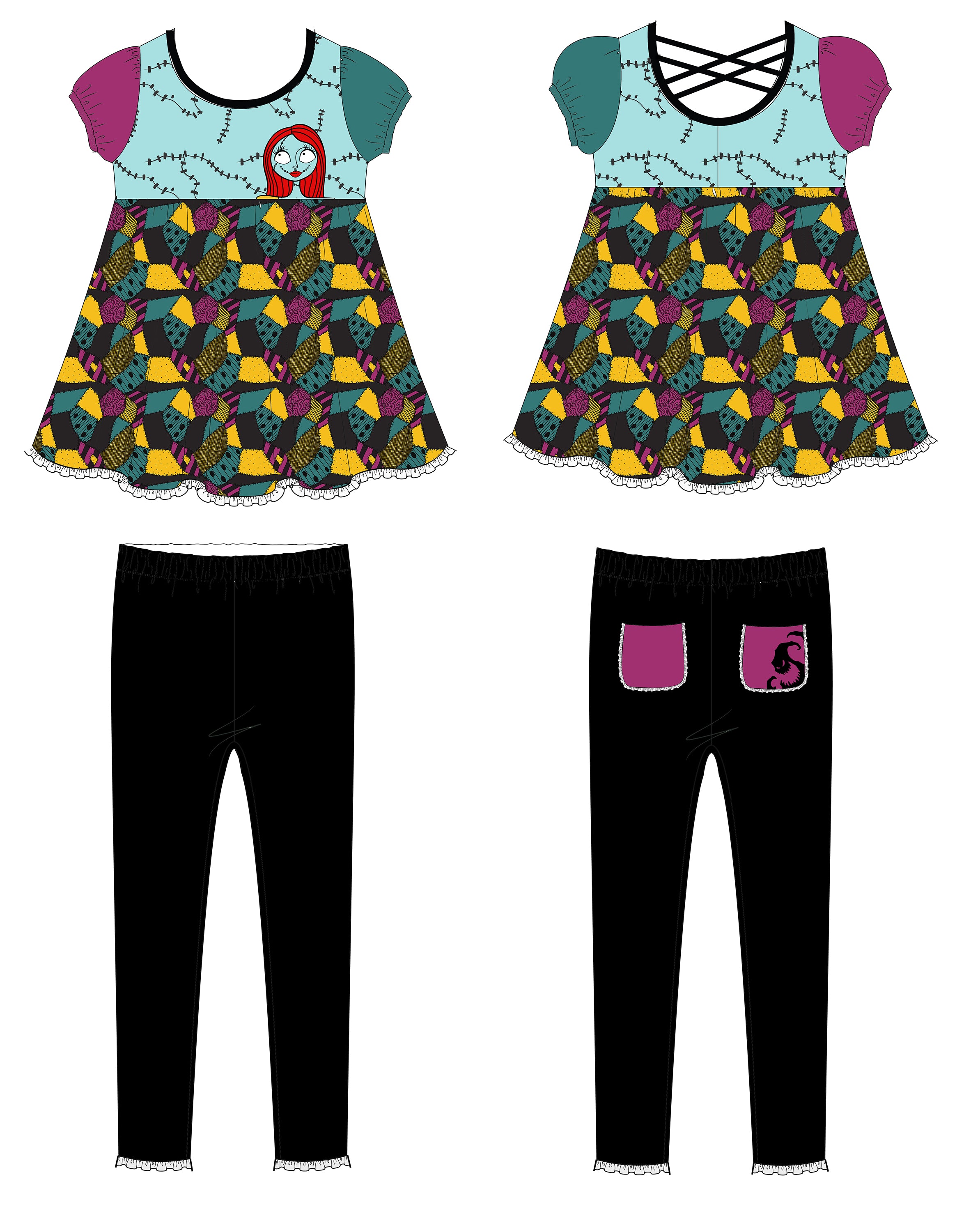Mix, match, and patch it up! Our Ragdoll knit set is the everyday take on the iconic Sally look. The top features puff sleeves, patchwork-printed panels, and a Sally graphic with stitching detail. A sweet crisscross back and delicate lace hem make it extra special. The leggings are stretchy and soft with back pockets—one featuring a silhouette of her stitched-up sweetheart. Designed to pair perfectly with The Ragdoll dress or to stand out all on its own!