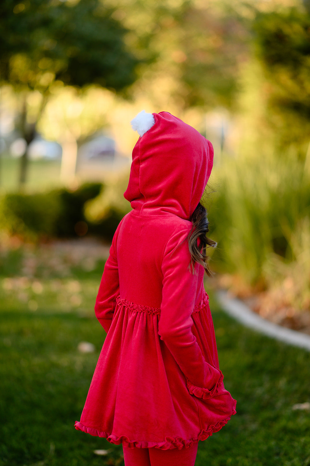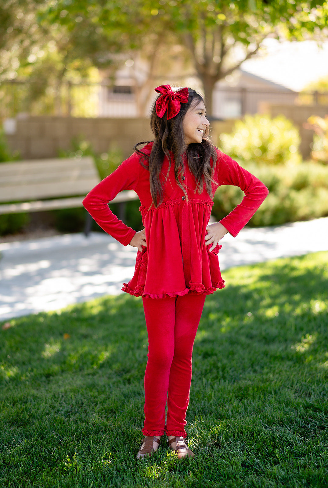 Stylish velvet hooded cardigan with three stylish buttons, a flared skirt, and charming ruched trim. This velvet is VERY flowy & stretchy. Ideal for winter layering, featuring pockets. A must-have in your child's closet for both comfort and style.